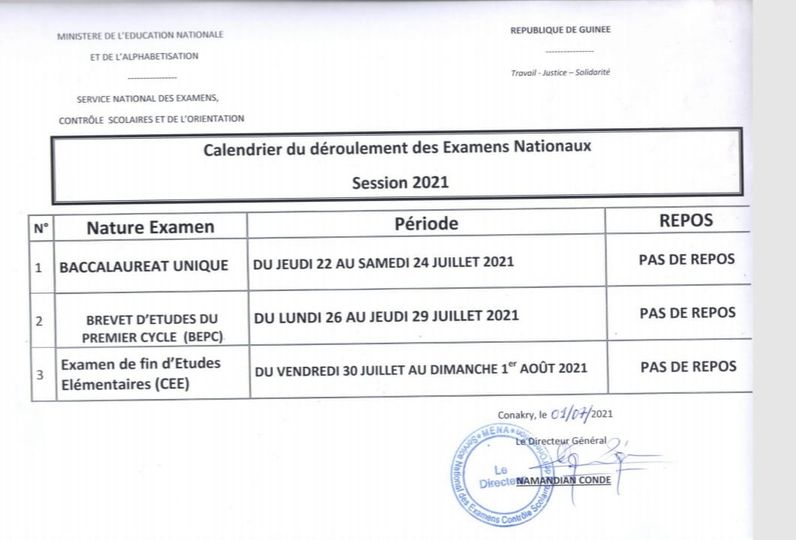 Internationale Guinée / MEN-A : calendrier du déroulement des Examens Nationaux Session 2021. Publié 5 ans depuis sur 2 juillet 2021 Par Admin 3 Source: MENAG Sujets liés:education Cliquez pour commenter LES + LUS DE LA SEMAINE